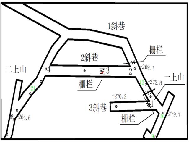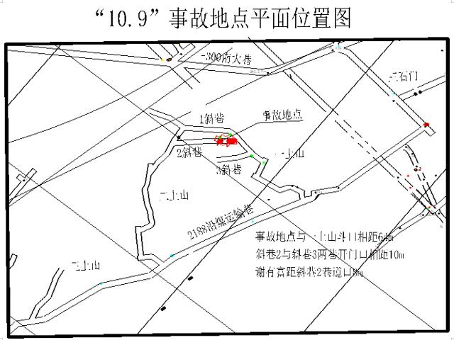 事故调查组于10月9日第一次到2188一上山现场勘查,事故现场如下示意图: