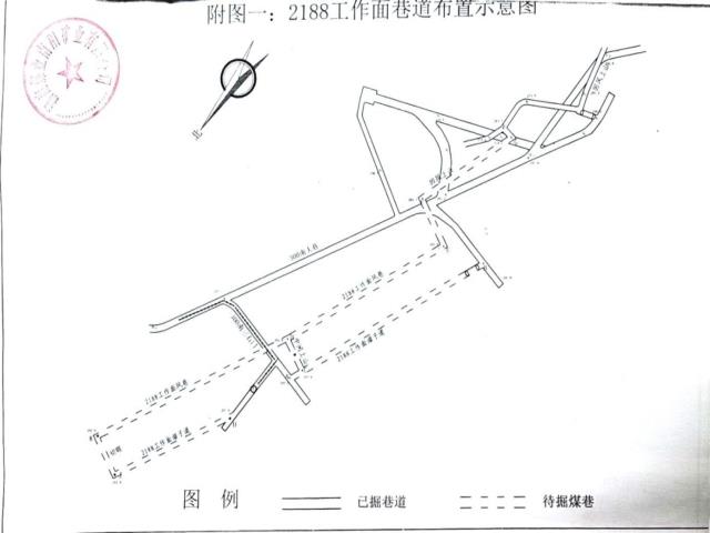 2024年12月19日,淝江煤矿编制了《2188工作面掘进作业规程》,并向南阳公司报批。12月21日,南阳公司以《关于的批复》(南矿生技函〔2024〕117号),批复同意淝江煤矿2188工作面巷道布置及作业方式,同时提出“加强盲巷管理,对不通风的巷道必须打好牢固的栅栏或密闭”的工作要求。批准的工作面巷道布置如下图。