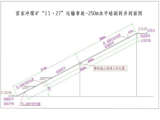 事故地点位于-250m水平暗副斜井上部车场上变坡点往下280m处。(如图1、2)