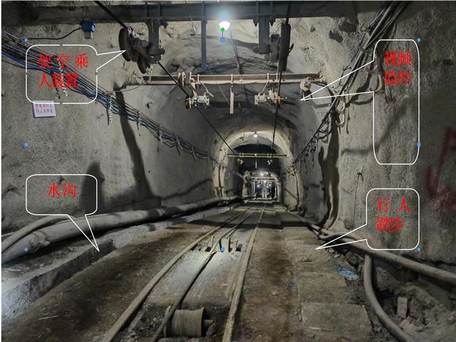 (2)-250m水平暗副斜井改造施工情况。-250m水平暗副斜井是技改利用井筒,原井筒无支护。上车场标高+4.572m,下车场标高-247.15m,倾角25°,长度约596m,担负提升煤矸、下放设备材料和运输人员任务,采用单轨串车提升,安装了1台JTPB-1.6×1.5P-31.5型单滚筒绞车和RJY30-27/600型可摘挂式架空乘人装置。