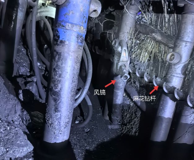 工作面右侧铺设搪瓷溜槽用于溜煤,溜煤道宽0.4m,利用主梁中柱将上山行人侧与溜煤道隔开;行人侧安装有高压胶管、压风管和水管。切眼往上6m处有1台煤层注水打孔用的风煤钻、麻花钻杆和1台风镐(见图4、5、6)。